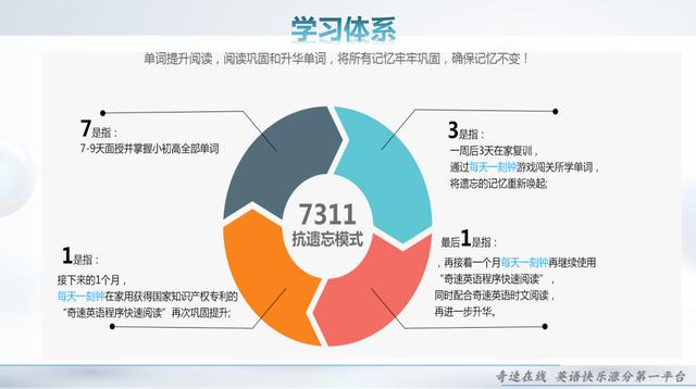 记忆都有遗忘,但根据遗忘的规律,按照系统、科学的抗遗忘巩固环节,对单词记忆进行深入的巩固,便能保证记忆永不忘记。奇速英语创始人蔡章兵教授及其学术团队充分结合人的大脑遗忘规律,根据这一规律制定了一套抗遗忘的学习方法——"7311"抗遗忘学习法,来确保学生记忆不忘。
