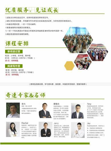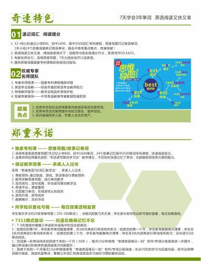奇速国际精英特训营采用的是奇速独家研发的国家专利课程“思维导图故事记单词”和“24个故事串记单词”,以迅雷之势,7天高效记忆小学800、初中1600和高中3500单词,实现英语阅读快速涨分。让学生爱上英语学习、享受英语,快速提升英语成绩,打造权威精英特训。