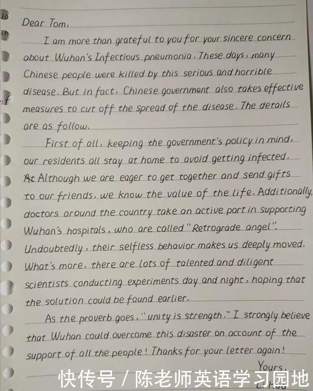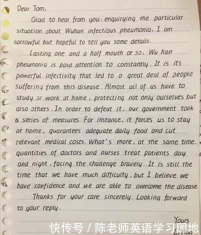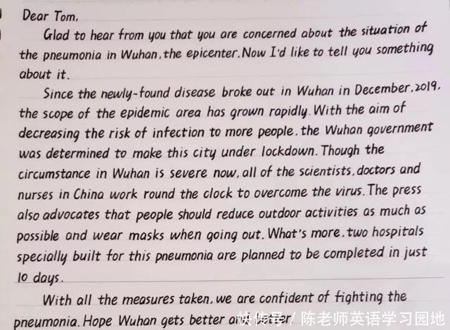 我很高兴收到你的来信,询问有关武汉新型冠状病毒的事情。在此我写信想告诉你这些。自2019年12月起武汉爆发传染性疫情以来,为了防止疫情恶行传播,中国政府已经果断封锁武汉。与此同时,虽然全国各地也陆续发现病例,但中国人民积极面对,与武汉共同抗疫。