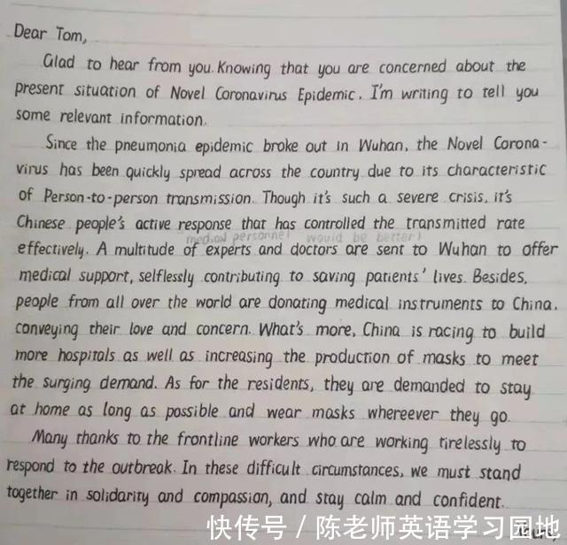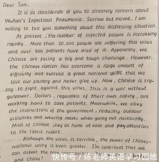 看完题目都有思路了吗?病毒、肺炎、传染性、抗“疫”等单词、词组都想起来了吗?快来赏读一下学霸是怎么写的吧!